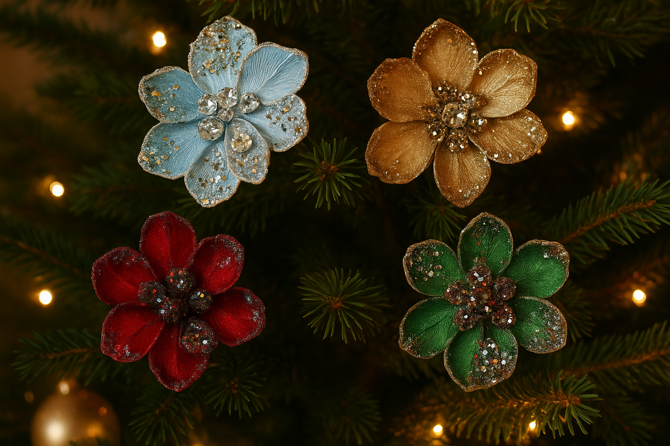 Bring your Christmas tree to life with flower picks and ornaments featuring lush poinsettias, glittered magnolias, and frosted blooms for branches that truly shine.