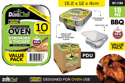 View full detailsDuraChef value pack of 10 aluminium foil containers with matching foil lids. Sized 15.2 × 12 × 4 cm, they’re designed for oven use and BBQ-friendly...