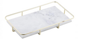 The Nuvolo Tray Grey with Gold Handles is a beautiful and useful item. It is made of sleek marble with metal handles and features a cool color scheme of grey.