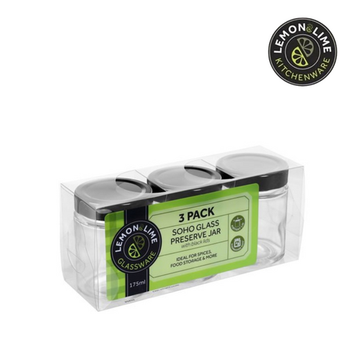 View full detailsOur Lemon and Lime Soho Glass Preserve Jar with Black Lid 260ml 3pk is made of sturdy glass with a black screw-top lid to maintain freshness. Our d...