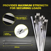 Cable Ties Stainless Steel 250mm x 4mm 10pc provides maximum strength for securing loads, fully and smooth edges.
