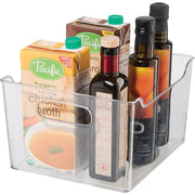 Store taller bottles and pantry refills in a sturdy bin with open access. The broad footprint keeps contents upright and organized.