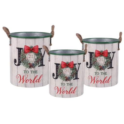 View full detailsThis set of three Joy To The World metal planters are a great way to add a festive holiday vibe to any space. The durable metal construction is des...