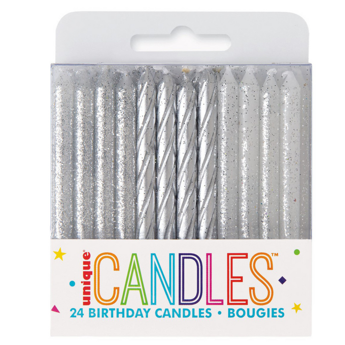 24 Silver & Silver Glitter Assorted Spiral Candles