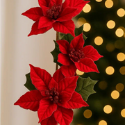 Elevate your holiday decorations with our set of three Poinsettia Red Velour Stems, each measuring 62cm in length. These stunning artificial poinsettia stems bring a touch of festive elegance to your home, office, or event decor. Our Poinsettia Red Velour Stems feature rich, red velour petals that closely resemble real poinsettia flowers. The lush and vibrant red color adds warmth and sophistication to your holiday arrangements.