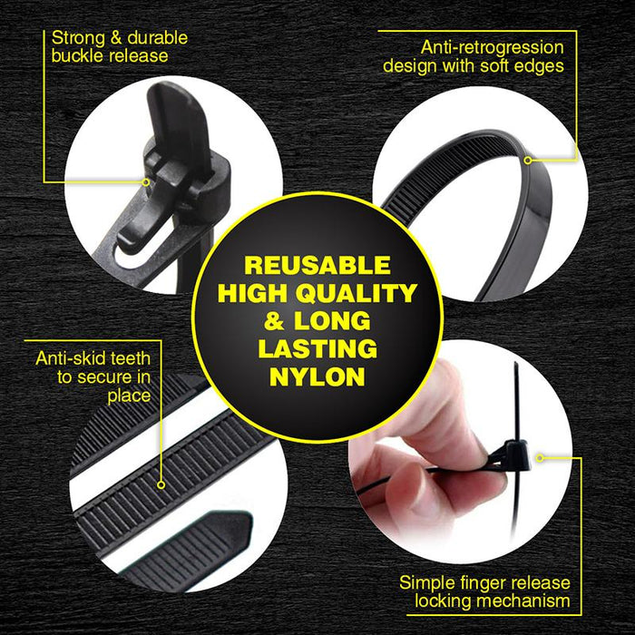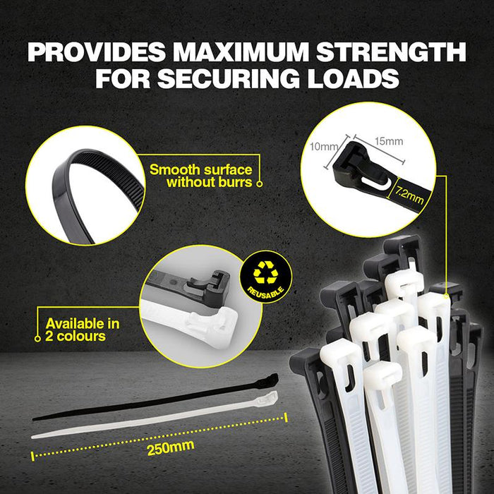 Cable Ties Releasable 250mm x 7.2mm 12pc a durable self-lock cable tie provides maximum strength for securing loads and smooth surface Burrs. Fast, easy, and convenient for a wide variety of jobs.